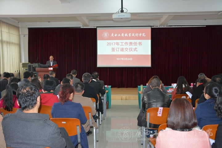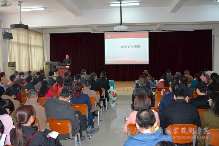 ?????? 2017年2月24號(hào)上午,我院于校本部報(bào)告廳舉行了開(kāi)學(xué)大會(huì),我院領(lǐng)導(dǎo)班子成員以及全體教職工參加了此次會(huì)議,會(huì)議由覃武云書(shū)記主持,學(xué)院院長(zhǎng)陳杰做開(kāi)學(xué)工作報(bào)告。