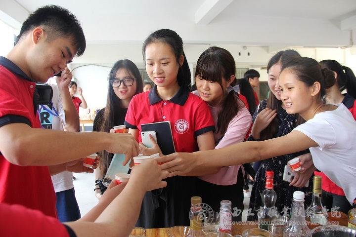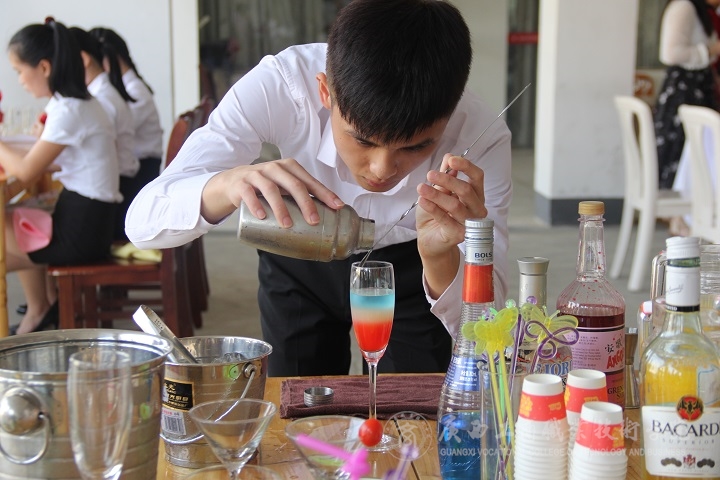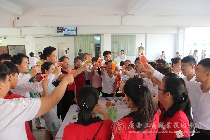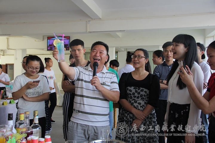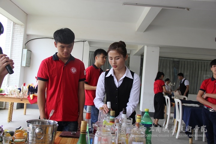 展演到了高潮環(huán)節(jié)。主持人邀請(qǐng)了兩位酒店專業(yè)的學(xué)生進(jìn)行現(xiàn)場(chǎng)調(diào)酒大比拼,令聲一響,他們便開(kāi)始忙碌起來(lái),熟練的動(dòng)作,從容而不失風(fēng)采。短短的幾分鐘,他們便調(diào)出了自己心儀的酒來(lái),還主動(dòng)邀請(qǐng)現(xiàn)場(chǎng)觀眾來(lái)品嘗。觀眾們喜笑顏開(kāi),喝了一杯,還想再來(lái)一杯!展演中還邀請(qǐng)了兩位非酒店專業(yè)的學(xué)生現(xiàn)場(chǎng)調(diào)酒,專業(yè)調(diào)酒人員手把手教學(xué),耐心地指導(dǎo)著。