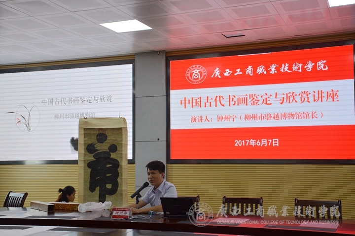 為豐富我院師生精神文化生活,2017年6月7日下午,我院在校本部舉辦中國古代書畫鑒定與欣賞講座。講座特邀請柳州市駱越博物館鐘州寧館長進(jìn)行講解,學(xué)院教師和同學(xué)們參加本次講座。