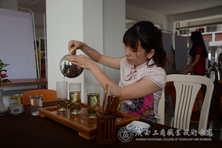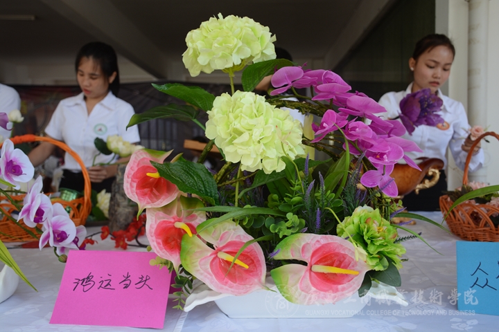 另外還有餐桌禮儀展示,展現(xiàn)了中西文化的融合。在茶藝展示過程中,技能人員表情專注、心態(tài)平和、認(rèn)真操作,讓圍觀的老師和同學(xué)在欣賞茶藝展示過程中去體會飲茶之樂,去享受生活的美好。隨后的花藝展示中,酒管的同學(xué)們用一雙心靈手巧的手,向在場的觀眾展示了插花的魅力。