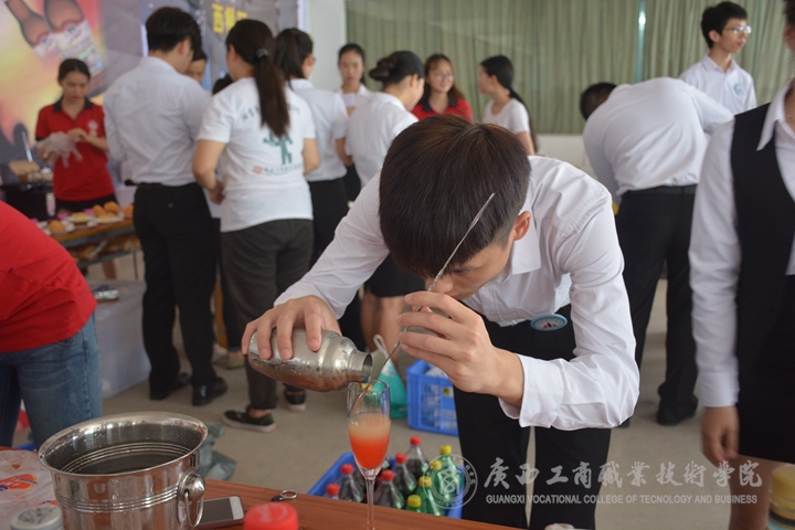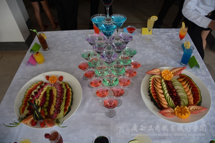 只見活動開始,調(diào)酒師們調(diào)制了五種顏色不一樣的雞尾酒,并將它們搭建成一座“金字塔”,成為展演過程中的一大亮點,吸引了許多同學(xué)圍觀并拍照留念。
