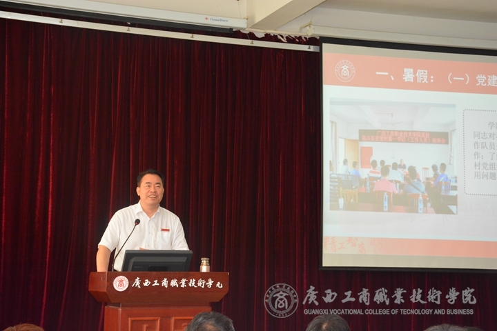 ?????? 隨后,由陳杰做開學(xué)工作報告。陳杰主要從暑假工作、開學(xué)工作、學(xué)期重點工作三大方面進行報告。他回顧總結(jié)了暑假期間黨建、教學(xué)、學(xué)工、人才、服務(wù)、民生、武鳴校區(qū)建設(shè)等各項工作開展情況,并做了開學(xué)工作及學(xué)期重點工作安排。報告將“堅持黨的領(lǐng)導(dǎo),落實管黨治黨、辦學(xué)治校主體責任”等六項黨建工作和持續(xù)推動以“提高教師素質(zhì)”為重點的教學(xué)水平升級等五項行政工作作為重點工作。