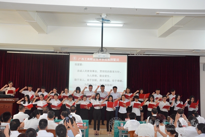 ?????? 會上,20多名新進教師在黨委組織部(人事處)副部長陶榮的帶領(lǐng)下上臺進行入職宣誓儀式?!拔倚模褐艺\人民教育事業(yè),貫徹黨的教育方針。為人師表,敬業(yè)愛生。 勤于育人,善于創(chuàng)新,勇于實踐,樂于奉獻。為國家立心,為民族鑄魂!”隨著一聲聲鏗鏘有利的誓言響起,全場響起一片熱烈的掌聲。