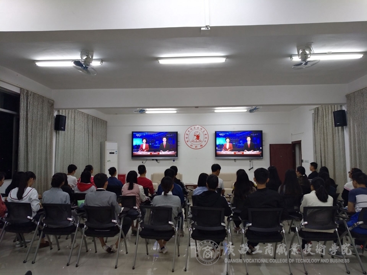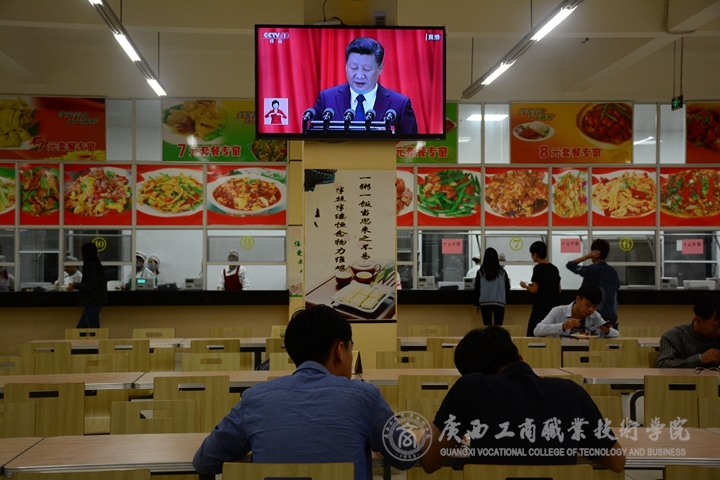在2119報告廳,學院領導、部門領導和青年教師早早就守候在電視屏幕前,整個報告廳座無虛席。上午9時許,隨著大會拉開帷幕,大家聚精會神傾聽習近平總書記代表代表十八屆中央委員會作的報告,認真地做筆記。同時,教務科研處組織教師在學術廳、校團委組織團學干部在易班活動室、思政沙龍的師生在素質實訓室收看實況轉播。學校LED大屏幕和學生食堂電視也轉播大會盛況。