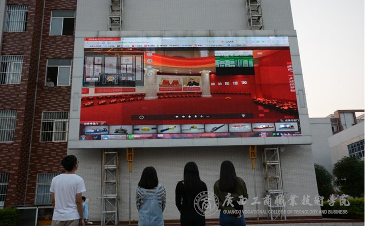 ? ? ? ?近日,在廣西工商職業(yè)技術(shù)學院校園中,處處洋溢著喜慶、和諧的氣氛,廣大師生通過食堂電視、學院led、手機、電腦等媒體,瀏覽和收看“砥礪奮進的五年”大型成就展網(wǎng)上展館。在學院教學樓、學生活動中心和學生宿舍中,院領(lǐng)導、教師和年輕的莘莘學子一起,共同感受祖國變化的視覺盛宴,增強民族自豪感和自信心。
