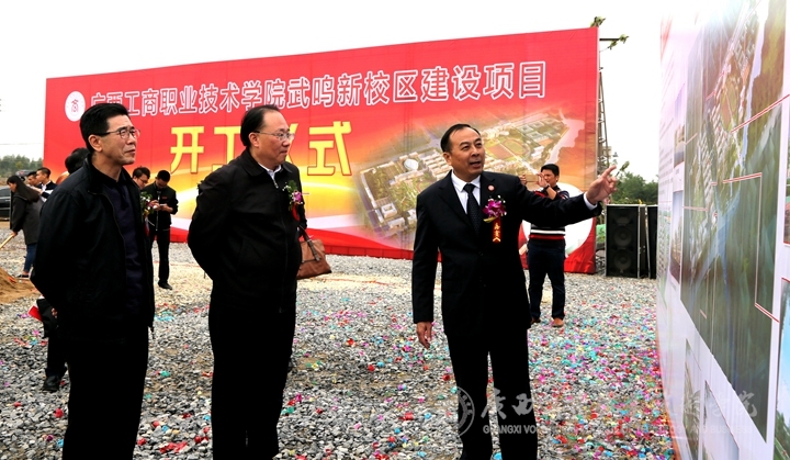 ? ? ? ? 啟動儀式結束后,林愈溪、白志繁等與會領導、嘉賓一行依次觀看展板,聽取廣西工商職業(yè)技術學院領導介紹項目進展情況,并就校園規(guī)劃等工作進行了具體指導。