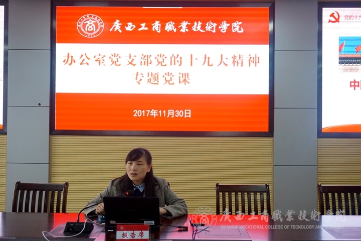 ? ? ? ? 根據(jù)學院十九大精神學習安排,辦公室黨支部于11月30日下午在2119視頻會議室組織舉辦了學習黨的十九大精神專題黨課。此次黨課由辦公室黨支部書記覃遠霞主持,院長陳杰和覃遠霞分別上了一節(jié)黨課,部門全體人員參加。