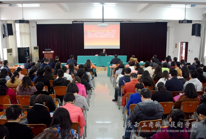 ? ? ? ? 為推進(jìn)深入學(xué)習(xí)宣傳貫徹黨的十九大精神, 12月22日上午,我院舉辦黨的十九大精神宣講報告會,邀請自治區(qū)北部灣經(jīng)濟(jì)區(qū)和東盟開放合作辦公室副主任、黨組成員梁金榮作了題為《深入領(lǐng)會十九大精神 奮力譜寫青春新華章》的宣講報告。學(xué)院黨委副書記、院長陳杰主持報告會,學(xué)院全體教職工和學(xué)生代表參加報告會。