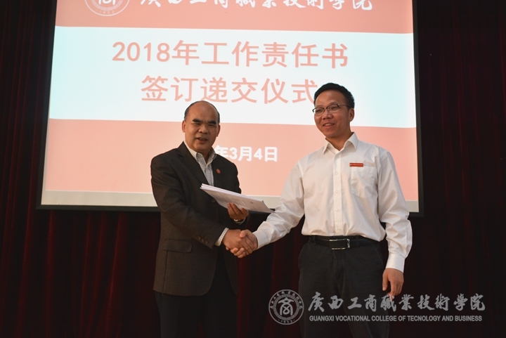 ? ? ? ? 在工作責(zé)任書(shū)簽訂遞交儀式上,覃武云與各部門(mén)負(fù)責(zé)人分別簽訂了2018年工作責(zé)任書(shū),,即2018年黨建工作責(zé)任書(shū)、黨風(fēng)廉政建設(shè)責(zé)任書(shū)、基層黨組織落實(shí)意識(shí)形態(tài)工作主體責(zé)任責(zé)任書(shū)、安全穩(wěn)定工作責(zé)任書(shū)。