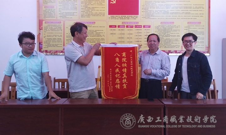 ? ? ? ? 八角村黨總支李書記眼含淚水代表全體村民為學(xué)院送上“商院傾情真扶貧、八角人民記恩情”錦旗,“感謝廣商院黨委、感謝廣商院的全體教職員工”.
