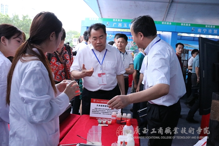 ????? 在主題展示的展區(qū)里,我院展臺(tái)學(xué)生帶來了農(nóng)藥殘留的檢測(cè),大米外觀品質(zhì)檢測(cè),大米新鮮度檢測(cè)和愛糧節(jié)糧宣傳。吸引了許多參展嘉賓到我院展臺(tái)了解。我院陳杰院長(zhǎng)也到場(chǎng)跟我院展臺(tái)師生進(jìn)行親切交流,陳杰院長(zhǎng)向?qū)W生了解了三種檢測(cè)技術(shù)的用途,并和展臺(tái)師生代表,舞臺(tái)展演師生代表進(jìn)行了合影留念。