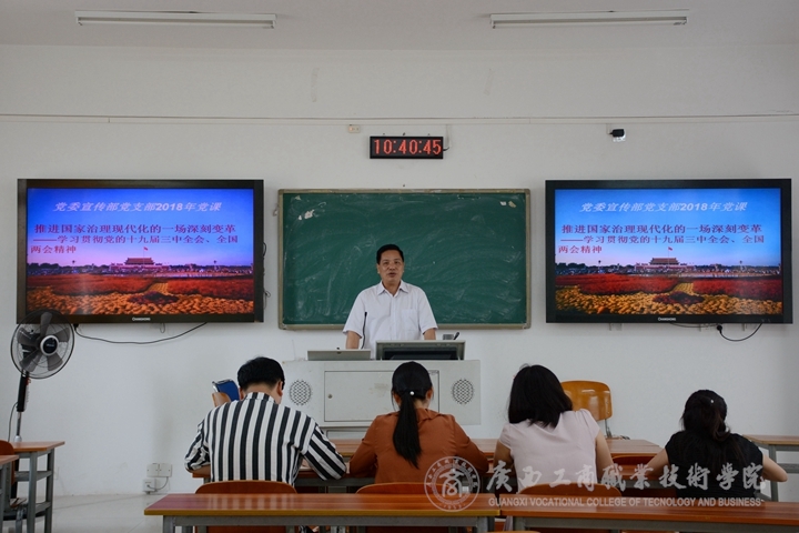 ? ? ? ?2018年5月15日上午,黨委宣傳部黨支部于鵬飛校區(qū)教學樓開展黨課活動,本次黨課主講人為黨委宣傳部黨支部書記韋勝強,黨委宣傳部黨支部全體黨員參與。