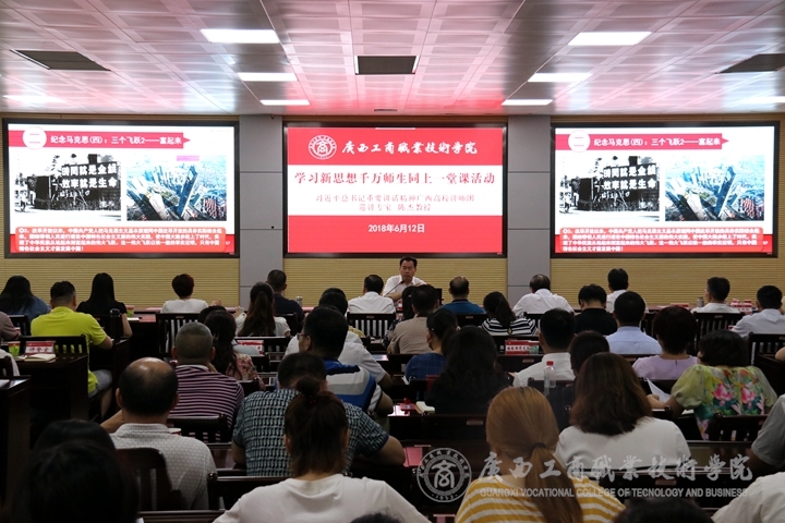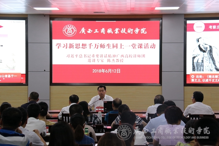 ? ? ? ? 為深入學(xué)習(xí)宣傳貫徹習(xí)近平總書記在北京大學(xué)師生座談會和紀(jì)念馬克思誕辰200周年大會上重要講話精神,按照教育部要求,學(xué)院于6月12日下午在鵬飛校區(qū)會議室開展“學(xué)習(xí)新思想千萬師生同上一堂課”活動。本次學(xué)習(xí)活動由學(xué)院院長、習(xí)近平總書記重要講話精神高校講師團(tuán)巡講專家陳杰教授主講,學(xué)院黨委書記覃武云、黨委副書記、紀(jì)委書記蒙啟成、副院長李仕欽、副院長陳寧春出席活動,學(xué)院黨委委員、紀(jì)委委員,中層以上干部,各黨總支、直屬黨支部委員及學(xué)生代表參加活動。本次活動由覃武云書記主持。