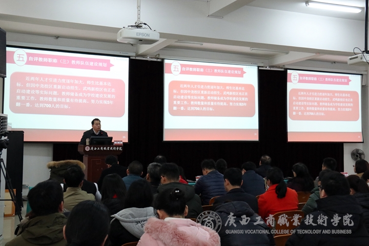 2019年1月11日,學(xué)院于鵬飛校區(qū)2145報(bào)告廳召開2018—2019學(xué)年第一學(xué)期期末大會(huì),學(xué)院黨委書記覃武云、院長陳杰、黨委副書記、紀(jì)委書記蒙啟成、副院長李仕欽、副院長陳寧春出席,各部門、各單位負(fù)責(zé)人、全體教職工參加了會(huì)議。本次會(huì)議由覃武云書記主持。