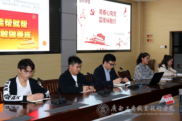 ??????? ?"學(xué)習(xí)雷鋒好榜樣,忠于革命忠于黨,愛憎分明不忘本,立場堅(jiān)定斗志強(qiáng)。"2019年3月5日晚上,廣西工商職業(yè)技術(shù)學(xué)院鵬飛校區(qū)教學(xué)樓報(bào)告廳響起了一陣簡潔明快、鏗鏘有力的歌聲。這首曾經(jīng)感染和激勵(lì)著一代又一代人的《學(xué)習(xí)雷鋒好榜樣》,此時(shí)此刻,激起了在現(xiàn)場的廣商院人“唱雷鋒,學(xué)雷鋒,做雷鋒”的滿腔熱忱,營造著向上向善、德行天下的良好風(fēng)尚。