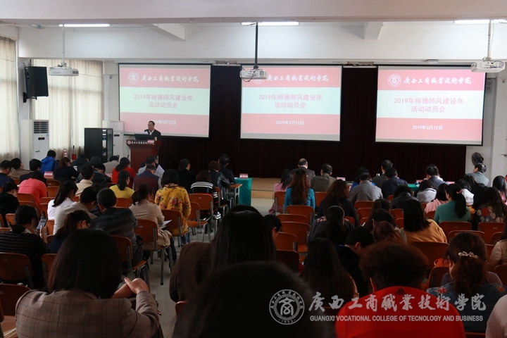 ? ? ? ? 2019年3月12日下午,我院于鵬飛校區(qū)報(bào)告廳召開(kāi)2019年師德師風(fēng)建設(shè)年活動(dòng)動(dòng)員大會(huì)。學(xué)院黨委書(shū)記覃武云、院長(zhǎng)陳杰、黨委副書(shū)記、紀(jì)委書(shū)記蒙啟成、副院長(zhǎng)李維、副院長(zhǎng)陳寧春出席會(huì)議,學(xué)院教職工參加動(dòng)員大會(huì)。本次大會(huì)由副院長(zhǎng)李維主持。