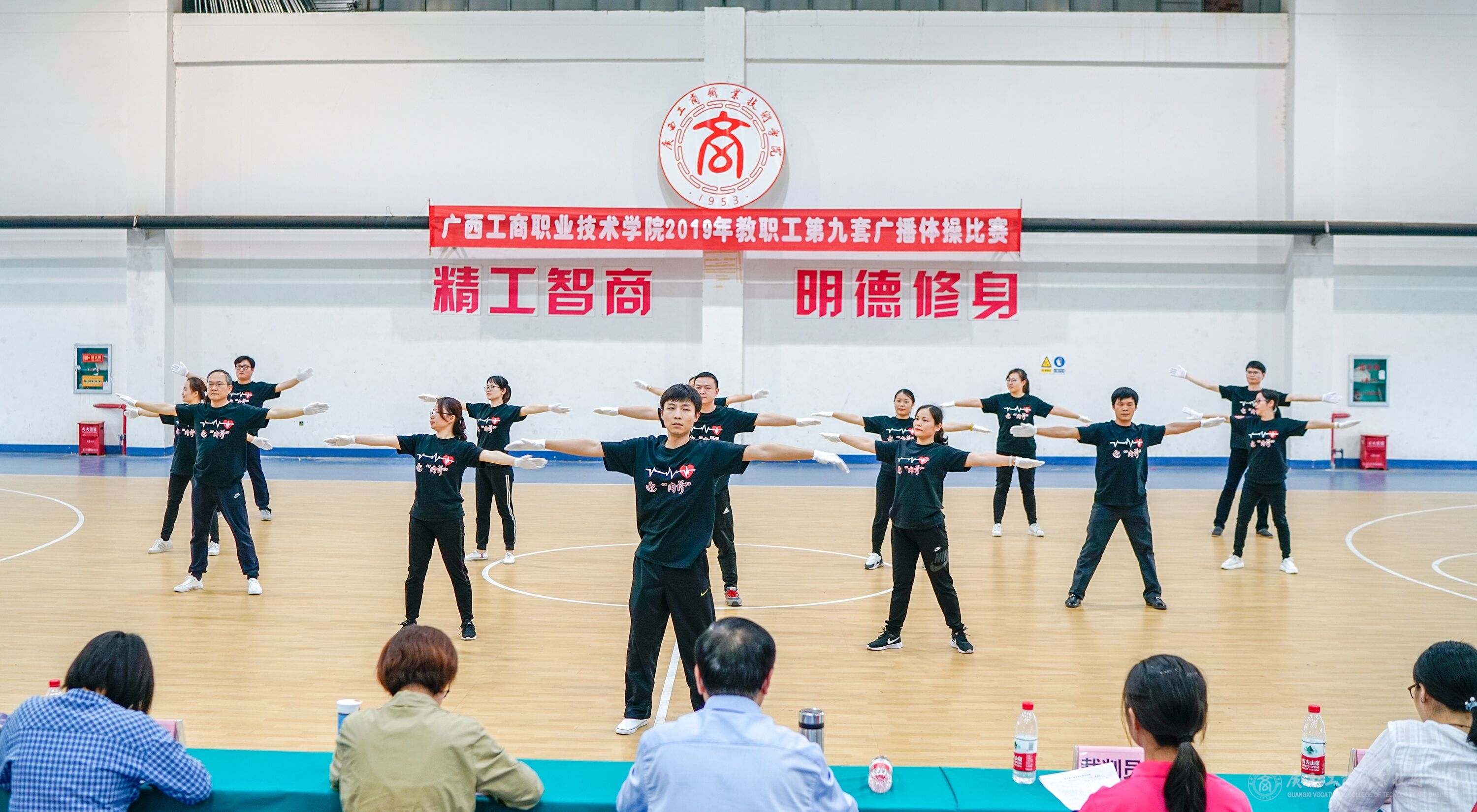 ? ? ? ?4月12日,我院于鵬飛校區(qū)文體館二樓舉辦2019年教職工第九套廣播體操比賽,各分工會(huì)、直屬工會(huì)小組成員參加了此次比賽,學(xué)院黨委副書(shū)記、紀(jì)委書(shū)記、工會(huì)主席蒙啟成出席并參加了比賽,學(xué)院副院長(zhǎng)李維出席并擔(dān)任了比賽的評(píng)委。裁判長(zhǎng)由陸長(zhǎng)英擔(dān)任。