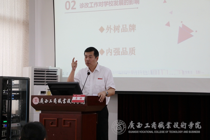 ? ? ? ? 5月21日下午,我院于鵬飛校區(qū)2145報告廳召開內部質量保證體系診斷與改進工作推進會。學院院長陳杰、黨委副書記、紀委書記蒙啟成、副院長李仕欽、副院長李維、副院長陳寧春出席會議。全體中層干部、各系部全體教師、教務科研處、黨委學生工作部、黨委教師工作部、現代教育技術中心和評估督導室相關人員等參加會議,本次會議由院長陳杰主持。