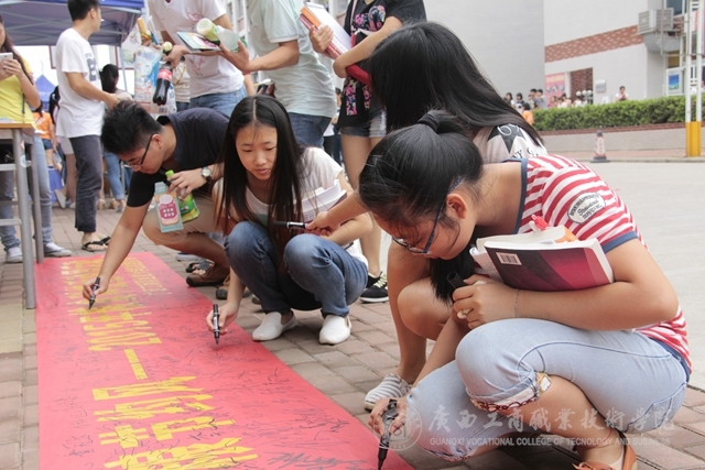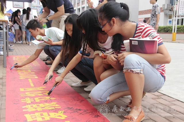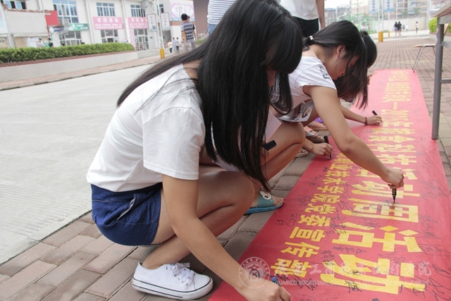 2015年5月25日中午,我院在校本部食堂前舉行糧食科技活動(dòng)周——節(jié)糧倡議簽名活動(dòng)并發(fā)放愛糧節(jié)糧科普宣傳冊(cè)。簽名活動(dòng)現(xiàn)場(chǎng)“糧食科技活動(dòng)周”的宣傳橫幅格外醒目,過往的同學(xué)、老師們甚至是掃地的阿姨都紛紛駐足停留在橫幅前,參與簽名活動(dòng),在橫幅上留下自己的名字?;顒?dòng)現(xiàn)場(chǎng)還給同學(xué)們派發(fā)了關(guān)于節(jié)約糧食的宣傳冊(cè)子,冊(cè)子上“一滴汗,一滴糧”“我光盤,我光榮”等宣傳標(biāo)語引人深思,同學(xué)們拿過宣傳冊(cè)邊走邊看。