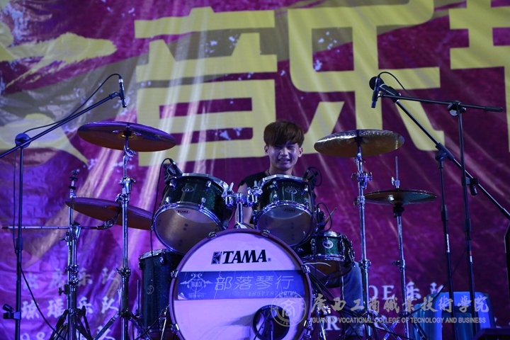 ? ? ? ? 本次音樂節(jié)活動主場共有8個樂隊出席。首先出場的是來自學(xué)院的“塘角魚樂隊”,風(fēng)馳電摯的音樂震耳欲聾,精彩的表演點燃夏日激情。隨后,在大家的高聲歡呼下,工商“98k樂隊”、特邀嘉賓“二號倉庫樂隊”、“鯊魚辣椒醬樂隊”,“SPIRAL STAR RING樂隊”、“AOE樂隊”、“瓊瑤樂隊”輪番上場,每一場的表演都掀起了不一樣搖滾熱潮,各具特色的嗓音,主唱率性灑脫的演唱與吉他手、鼓手的精彩演奏完美結(jié)合,博得了場下“迷”妹“迷”弟們一陣熱烈的掌聲。