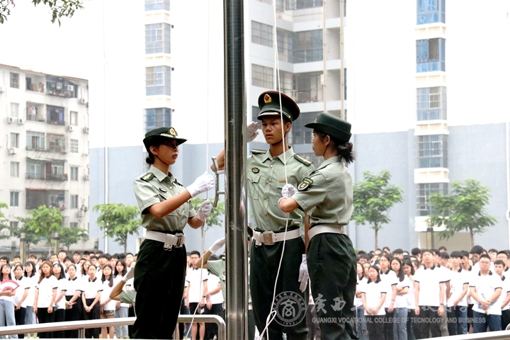??????? 隨著儀式正式開始,學(xué)院督察隊成員邁著鏗鏘整齊的步伐來到了國旗臺下。在激昂的《義勇軍進行曲》中,鮮艷的五星紅旗迎風(fēng)冉冉升起,全體師生行注目禮,共同奏唱國歌。