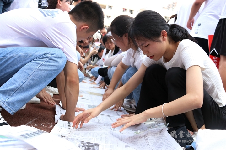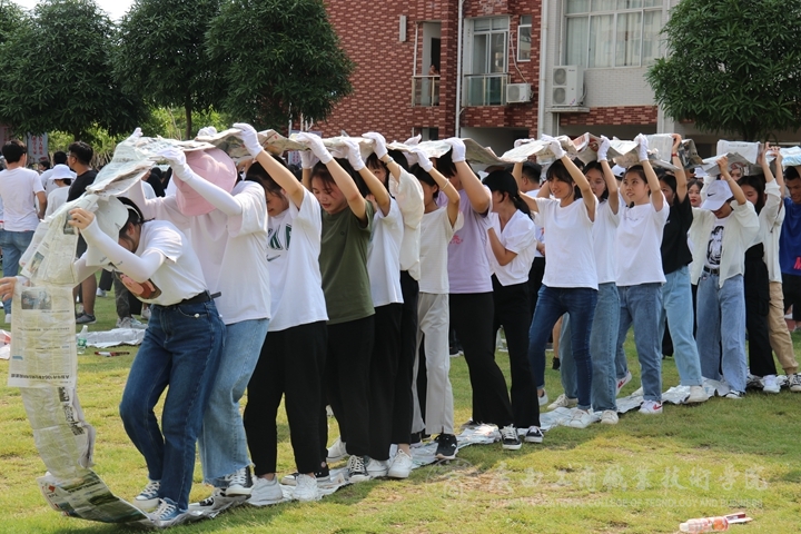 ? ? ? ? 緊接著第二個(gè)游戲“無(wú)敵風(fēng)火輪”,以分配足夠的報(bào)紙、膠帶、剪刀,用不同的方法將報(bào)紙一張張粘貼起來(lái),必須動(dòng)作迅速,完成后所有成員都要進(jìn)去,保持大家的步伐一致,同時(shí)報(bào)紙不能破損,這考驗(yàn)著各班同學(xué)的組織、協(xié)調(diào)能力以及指揮者一絲不茍的工作態(tài)度;