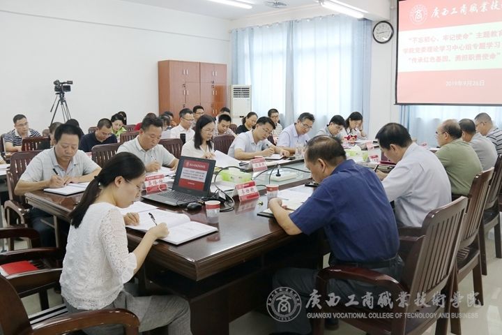 ? ? ? ? 9月26日下午,中共廣西工商職業(yè)技術(shù)學(xué)院委員會于我院鵬飛校區(qū)會議室召開“不忘初心、牢記使命”主題教育讀書班暨學(xué)院黨委理論學(xué)習(xí)中心組“傳承紅色基因,勇?lián)氊?zé)使命”專題研討會。學(xué)院黨委書記覃武云主持本次學(xué)習(xí)會議并做重點發(fā)言及總結(jié)發(fā)言。黨委副書記、紀委書記蒙啟成,黨委委員、副院長陳寧春在會上做重點發(fā)言。學(xué)院黨委理論學(xué)習(xí)中心組成員,學(xué)院處級以上黨員領(lǐng)導(dǎo)干部參加本次研討會。