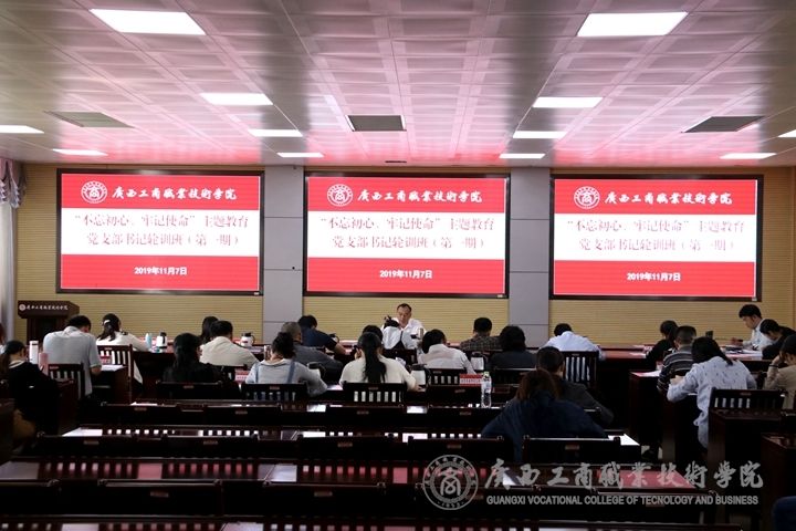 ??????? 11月7日下午,中共廣西工商職業(yè)技術(shù)學(xué)院委員會“不忘初心、牢記使命”主題教育第一期黨支部書記輪訓(xùn)班開班。本次輪訓(xùn)班開班輪訓(xùn)課由學(xué)院黨委副書記、紀(jì)委書記蒙啟成主講。學(xué)院各黨總支書記、黨支部書記;學(xué)院紀(jì)委委員;各黨總支、支部紀(jì)檢委員;學(xué)院“不忘初心、牢記使命”主題教育領(lǐng)導(dǎo)小組辦公室相關(guān)人員;監(jiān)察室、審計室全體人員參加了本次輪訓(xùn)。