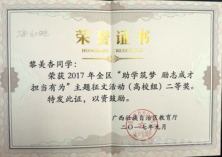(工商1603班黎美杏同學(xué)獲資助征文比賽二等獎)
