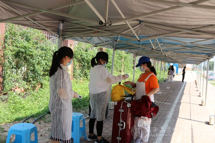 學(xué)子們陸續(xù)前來報(bào)到了,只見他們帶著行李,戴著口罩,踏進(jìn)安置在校門口的帳篷中,根據(jù)地上貼好的指示標(biāo)識,按1.5米間隔排隊(duì)等待著。在秩序引導(dǎo)員的指引下,先由工作人員對他們測量體溫,隨后行李消殺員對其行李進(jìn)行消殺,同學(xué)們再來到“口罩換取點(diǎn)”,取掉原口罩,放進(jìn)“口罩專用丟棄箱”,用免洗消毒液給雙手消毒,自取一個(gè)學(xué)院配發(fā)的新口罩戴上,隨后有序排隊(duì)到“第一次測溫點(diǎn)”測溫。