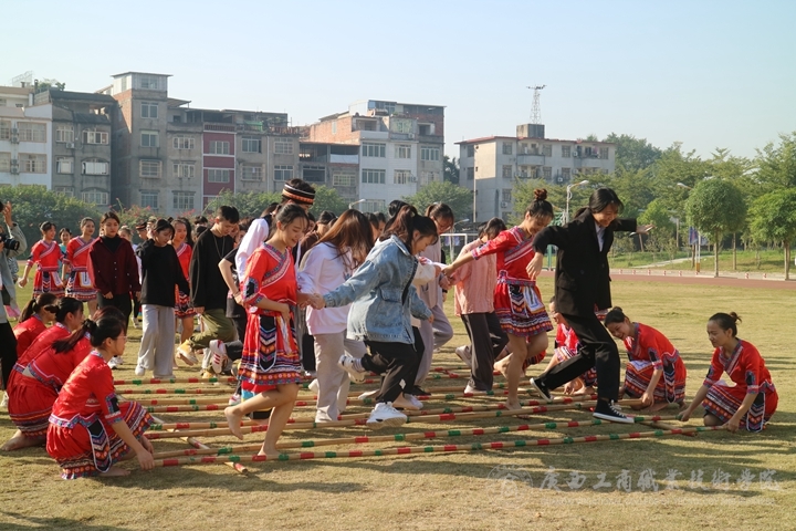 竹竿舞又稱跳竹竿,是一個以團隊合作為方式的舞蹈,具有濃厚的民族文化特色,是廣西壯族民間舞蹈形式之一。活動開始前,管理學院的同學們身穿民族服裝在田徑場跳起了竹竿舞,引來無數(shù)師生的觀看,隨后,圍觀的同學紛紛加入了跳竹竿舞的行列里。初練竹竿舞的同學,有的因為跳錯了步伐就被夾掉了鞋子,有的因亂踩竹竿而仰面朝天。在經(jīng)過一系列的練習過后,學生們個個精神飽滿,動作標準到位,持竿者在音樂的節(jié)奏中蹲、站等姿勢變化多樣,在有節(jié)奏、有規(guī)律的碰擊聲里,跳舞者在竹竿分合的瞬間,在歡快的樂曲中,敏捷地進退,瀟灑地跨竿,演繹出美麗的舞蹈。