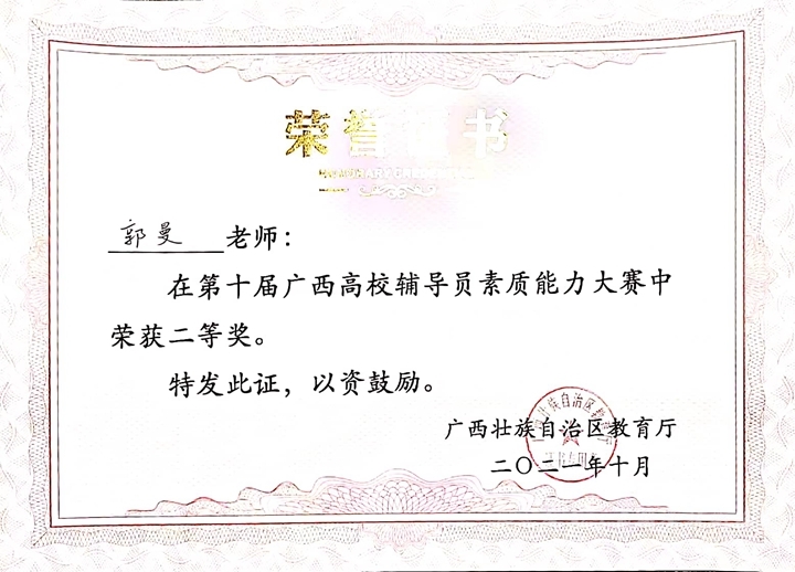 10月22日,由自治區(qū)教育廳主辦,教育部高校思想政治工作隊伍培訓(xùn)研修中心(廣西師范大學(xué))承辦的第十屆廣西高校輔導(dǎo)員素質(zhì)能力大賽在廣西師范大學(xué)圓滿落下帷幕。經(jīng)過三天激烈角逐,我校經(jīng)貿(mào)學(xué)院學(xué)生科科長、輔導(dǎo)員郭曼喜獲二等獎。