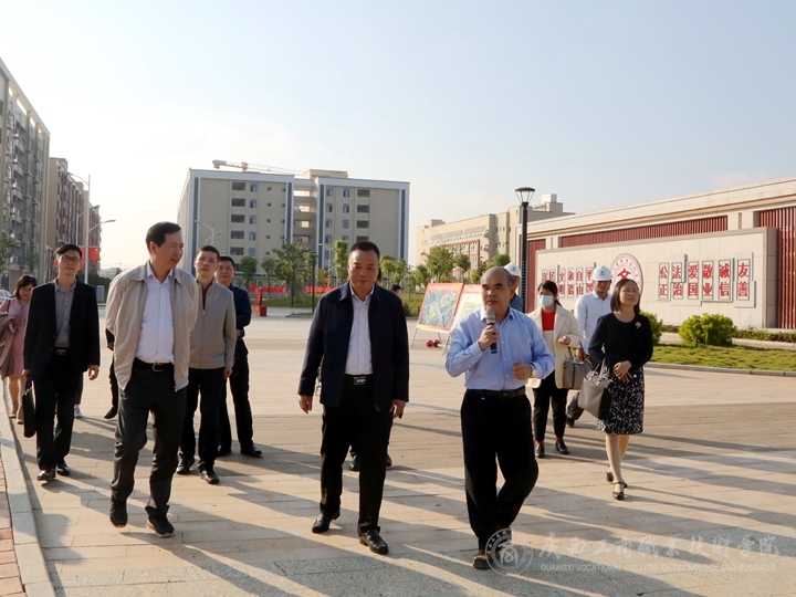 李祚標組長一行首先實地調(diào)研走訪武鳴校區(qū)建設(shè)情況,了解武鳴校區(qū)大學(xué)生活動中心、學(xué)術(shù)活動中心、圖書館、學(xué)生宿舍(校企合作基地)、食堂、商學(xué)商訓(xùn)樓、教學(xué)行政樓等建設(shè)及使用情況。