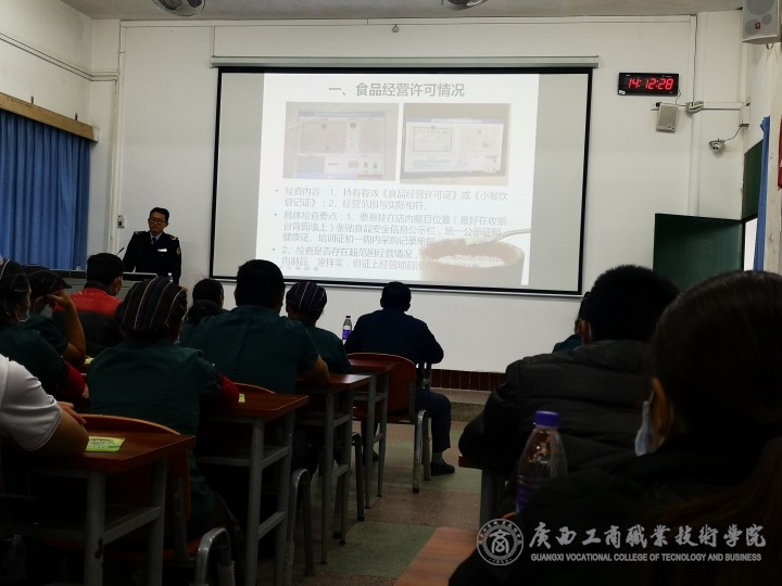 武鳴校區(qū)培訓(xùn)會上,武鳴區(qū)市場監(jiān)督管理局城北所熊紹永所長對武鳴校區(qū)食堂全體從業(yè)人員進(jìn)行了校園食品安全培訓(xùn)——餐飲環(huán)節(jié)食品安全相關(guān)要求及標(biāo)準(zhǔn)專題培訓(xùn),主要從餐飲環(huán)節(jié)食品安全監(jiān)管的重要性、餐飲環(huán)節(jié)食品安全基本情況及存在的突出問題、餐飲環(huán)節(jié)食品安全基本標(biāo)準(zhǔn)和要求三大方面深入淺出的講解了食品安全相關(guān)知識。同時,也舉例說明監(jiān)督檢查過程中發(fā)現(xiàn)的校園食堂存在食品安全問題,學(xué)法規(guī),明職責(zé),學(xué)案例,促警醒。
