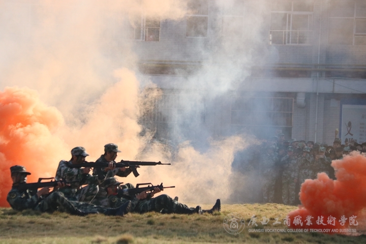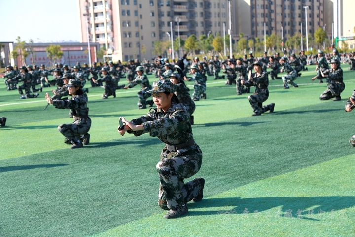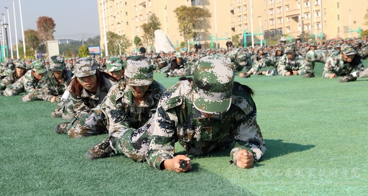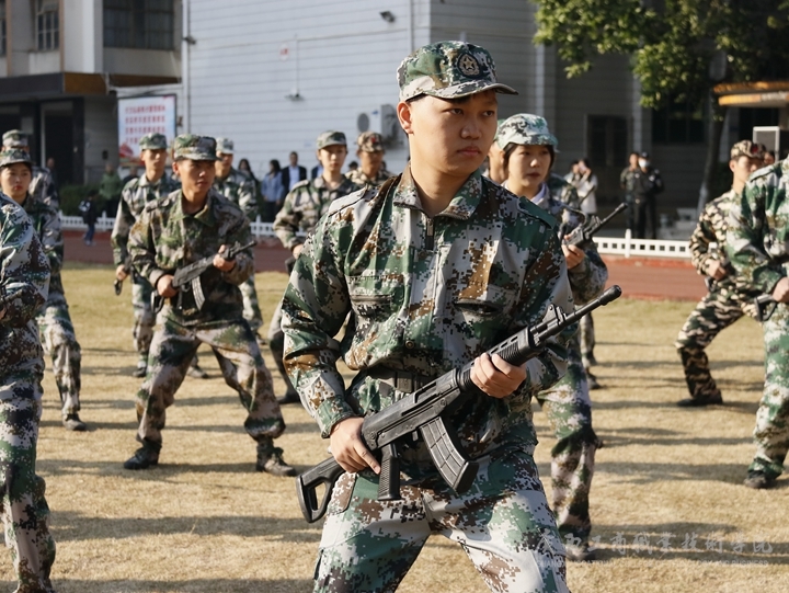 首先全體起立,奏、唱國歌,五星紅旗冉冉升起,大會拉開了帷幕。伴隨著雄壯的閱兵進行曲,軍訓匯報表演開始,2021級新生組成的各方塊隊伍依次進行分列式表演,他們穿著整齊的軍裝,邁著堅定的步伐,喊著嘹亮的口號依次通過主席臺,接受檢閱。匯報表演編字方塊隊倒數(shù)計時隊后,表演方塊隊依次進行列隊、軍拳術、刺術、持槍在煙霧彈中匍匐前進匯報等戰(zhàn)術表演,展現(xiàn)了同學們刻苦訓練取得的驕人成果。