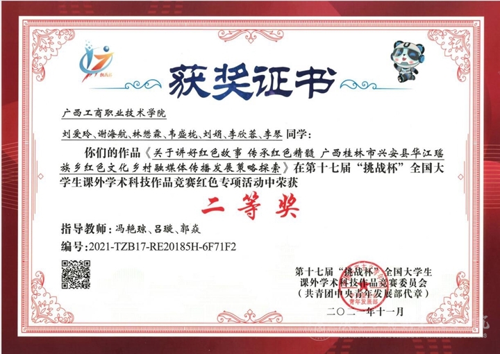 4月12日晚上,第十七屆“挑戰(zhàn)杯”工商銀行全國(guó)大學(xué)生課外學(xué)術(shù)科技作品競(jìng)賽閉幕式暨“科創(chuàng)先行 強(qiáng)國(guó)有我”網(wǎng)絡(luò)主題活動(dòng)隆重舉行,團(tuán)中央書記處書記傅振邦,四川省副省長(zhǎng)楊興平,全國(guó)評(píng)審委員會(huì)主任、中國(guó)科學(xué)院院士袁亞湘,四川省人民政府副省長(zhǎng)楊興平等領(lǐng)導(dǎo)專家出席閉幕式。閉幕式表彰了一批先進(jìn)集體,我院與團(tuán)天津市委等10個(gè)省級(jí)團(tuán)委和北京大學(xué)等171所高校榮獲“專項(xiàng)賽優(yōu)秀組織獎(jiǎng)”,廣西有5所高校獲獎(jiǎng),我院是廣西高職院校唯一的獲獎(jiǎng)院校。