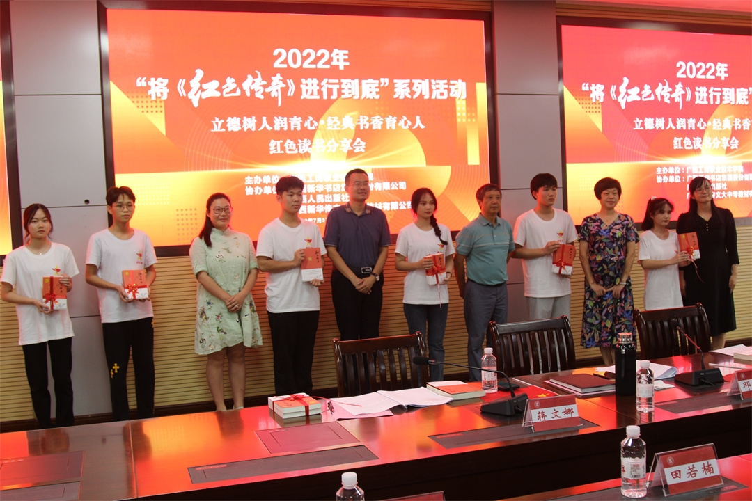 分享會(huì)后,與會(huì)領(lǐng)導(dǎo)、嘉賓向?qū)W生代表贈(zèng)送《紅色傳奇》讀本,鼓勵(lì)同學(xué)們不忘初心,傳承廣西紅色基因,以飽滿的熱情面向未來。在《不忘初心》的合唱聲中,本次交流分享活動(dòng)圓滿結(jié)束。