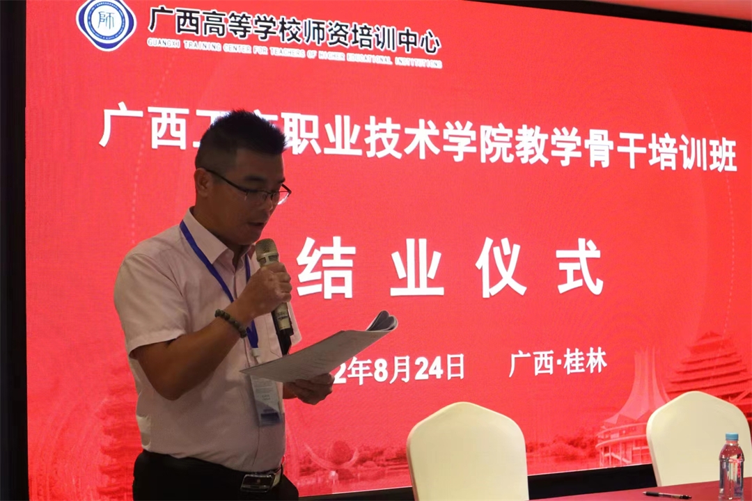 8月24日,學(xué)院2022年教學(xué)管理干部及骨干教師能力提升培訓(xùn)班結(jié)業(yè)儀式在桂林市悅璟酒店六樓會議廳舉行。結(jié)業(yè)儀式由廣西高等學(xué)校師資培訓(xùn)中心陳治萍副主任主持,學(xué)院紀(jì)委書記韋云鳳出席并講話,全體學(xué)員參加。
