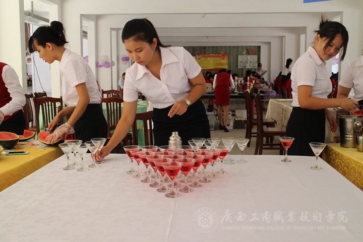 2015年6月27日9時許,廣西工商職業(yè)技術(shù)學(xué)院教學(xué)樓下面已是人潮涌動。和往年的畢業(yè)生供需見面洽談會暨頂崗實習(xí)推介會一樣,仍是有多達近200家企業(yè)涌入該校,進行人才選拔和招聘。不過今年該校倒是多了足以讓他們津津樂道的一道風(fēng)景——那就是,可以一邊吃著學(xué)院“烘焙作品展示區(qū)”提供的餅干和點心,一邊觀看小舞臺上的禮儀風(fēng)采展演,或者一邊欣賞旁邊“調(diào)酒技能展示區(qū)”的花樣調(diào)酒表演,順便請現(xiàn)場表演繪畫的同學(xué)畫張素描帶回去,真是一舉多得。不少企業(yè)表示,這樣輕松愉快的“嘉年華式”雙選會,還是第一次遇見。
