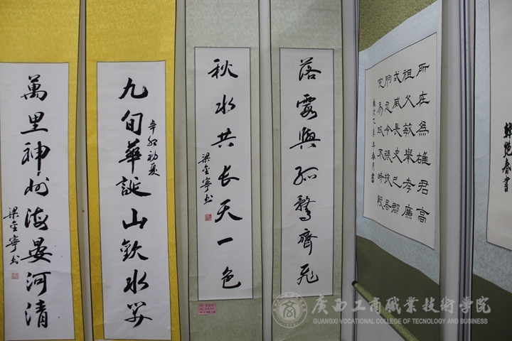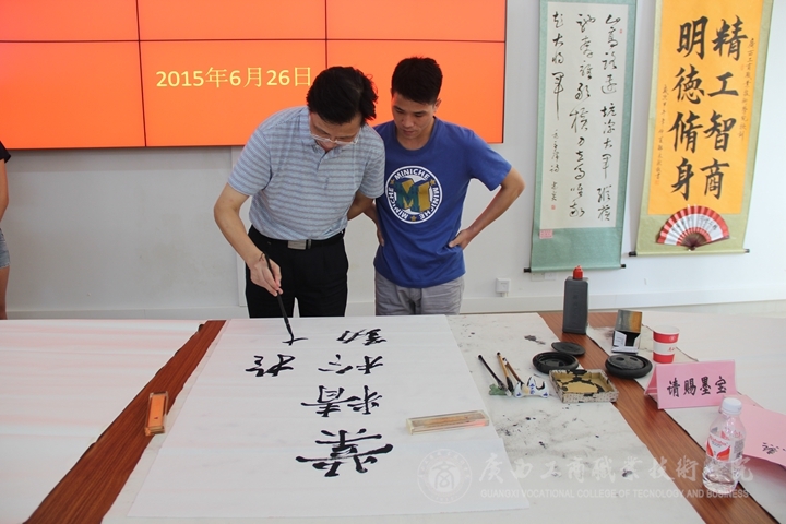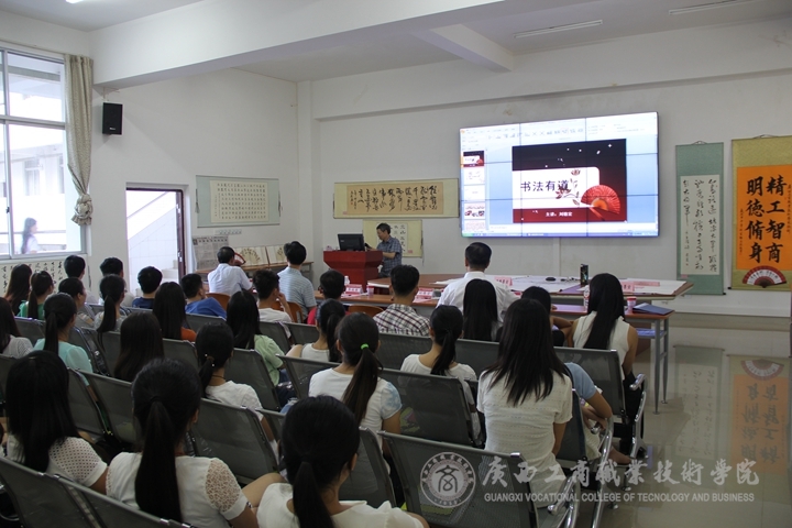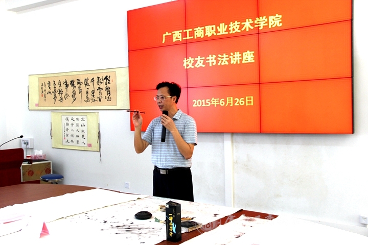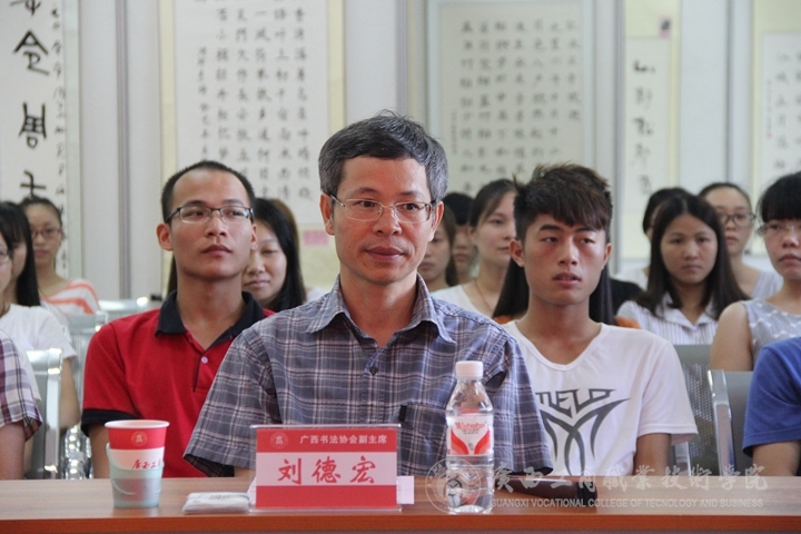 此次書法講座會上,廣西書法家協(xié)會常務副主席劉德宏上臺給在場各位講評了“書法有道”的概念。同大家觀看了一些自己的書法作品并熱情的與大家分享自己的創(chuàng)作心得以及自己在書法道路上的故事。接著自治區(qū)糧食局人事處處長韋尚英上臺發(fā)表講話,向大家講起了往年自己參加的一些書法比賽,就如何提高同學們對書法的興趣、書法基礎要領、如何寫好書法等問題做了詳細的講解并給同學們示范了一些字的點筆與勾勒。