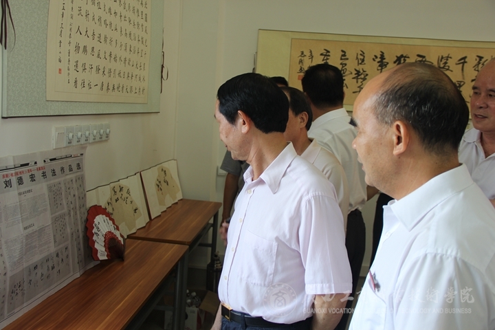 隨后,學院領導陪同老領導一起觀摩了陳列在展廳里校友和我院師生的一些優(yōu)秀書法作品,與學生互動提問、交流。