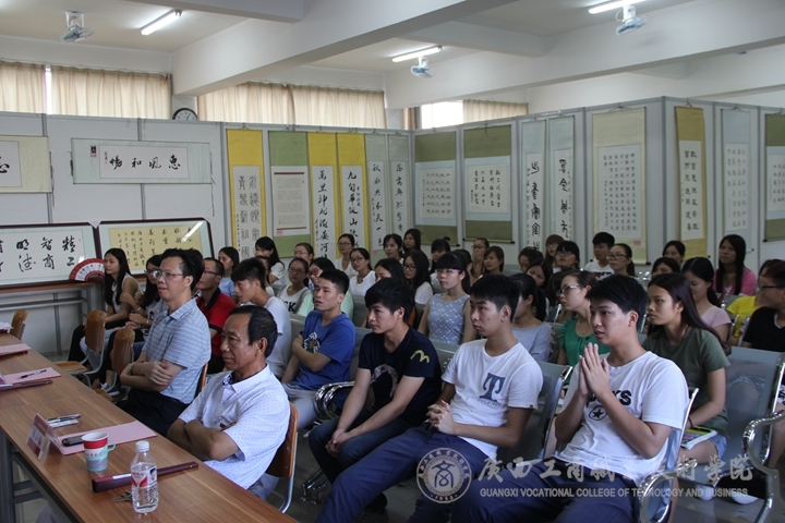 2015年6月26日下午,我院在校本部教學樓2514創(chuàng)業(yè)實訓中心召開校慶日校友書法講座。原財會792班校友、中國書法家協(xié)會理事、廣西書法家協(xié)會常務副主席劉德宏,原計統(tǒng)821班校友,自治區(qū)糧食局人事處處長韋尚英,學院副院長李維,檔案館籌建辦副主任韋小福,黨(院)辦副主任高潔,學院鴻軒書畫協(xié)會的學生代表及13級學生代表參加了書法講座。座談會由李維副院長主持。