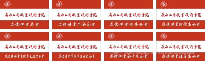在道德講堂硬件布置上,我院突出 “以德育商”元素,體現(xiàn)商院特色,設(shè)計(jì)了專門的“道德講堂”統(tǒng)一LOGO標(biāo)識(shí)、講堂背景板、道德箴言掛板及紀(jì)念品。并為道德講堂總堂、工會(huì)分堂、團(tuán)委分堂、學(xué)院學(xué)生組織分堂、學(xué)院學(xué)生社團(tuán)分堂和各系分堂制作了專門的“廣商育人紅”道德講堂旗幟。