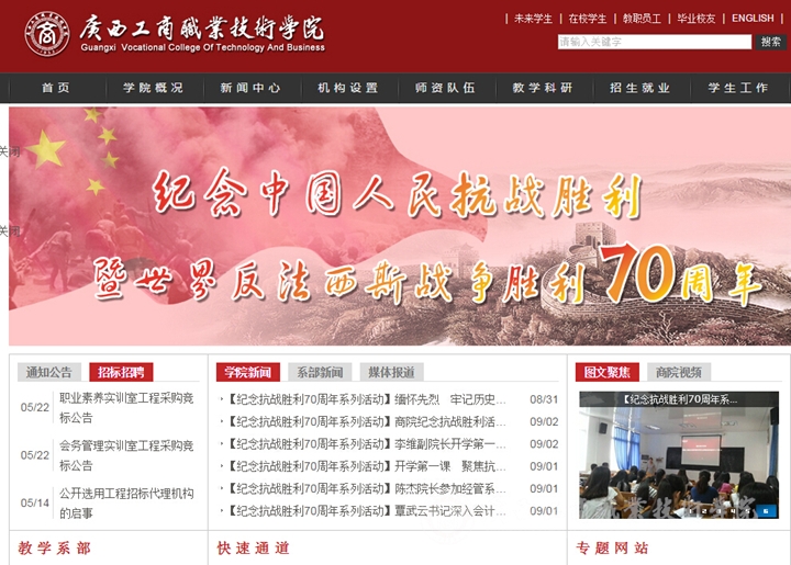 利用網(wǎng)絡(luò)平臺擴(kuò)大紀(jì)念活動受眾。在學(xué)院網(wǎng)站主頁開設(shè)了紀(jì)念中國人民抗日戰(zhàn)爭勝利70周年“網(wǎng)上祭英烈”的網(wǎng)頁。并組織全校師生員工登錄學(xué)院網(wǎng)站主頁,向抗戰(zhàn)英烈鮮花留言,在網(wǎng)上高揚(yáng)愛國主義主旋律,凝聚牢記歷史、圓夢中華的網(wǎng)上正能量。在學(xué)院主頁最顯著的頭圖位置更新主題為紀(jì)念中國人民抗日戰(zhàn)爭暨世界反法西斯戰(zhàn)爭勝利70周年圖片,在網(wǎng)絡(luò)平臺上營造濃厚的紀(jì)念氛圍。同時(shí),利用微信、微博等新媒體推送紀(jì)念抗戰(zhàn)勝利70周年相關(guān)內(nèi)容,多渠道擴(kuò)大紀(jì)念活動受眾。
