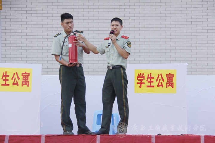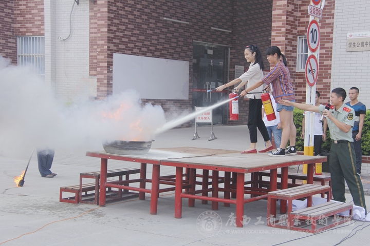 最后,武警南寧市西鄉(xiāng)塘消防大隊領(lǐng)導(dǎo)講授消防安全知識,他通過火災(zāi)現(xiàn)場的影像資料,圖文并茂地為廣大師生講解了火災(zāi)的危害性、樓層發(fā)生火災(zāi)后的逃生與自救方法、如何使用滅火設(shè)施。消防安全知識講解結(jié)束后,消防官兵做了滅火操作的演示,并邀請部分師生現(xiàn)場操作滅火器。在他的指導(dǎo)下,師生體驗者提著滅火器,按照滅火步驟和方法,將白色的粉末噴向大火,很快將明火撲滅。