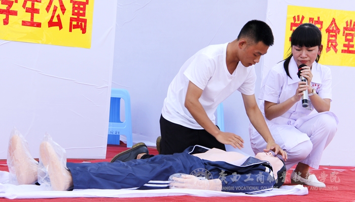 演練活動第三項是急救方法演練。由廣西中醫(yī)藥大學(xué)第一附屬醫(yī)院仁愛醫(yī)護人員講解正確的急救知識、急救方法和模擬人體進行急救,并邀請學(xué)生代表進行急救方法的體驗。