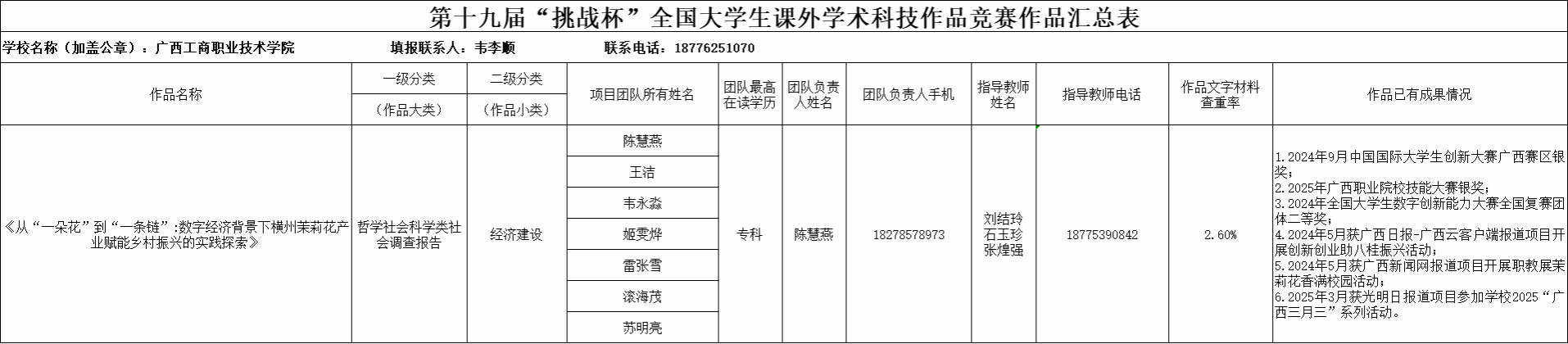 附件:第十九屆“挑戰(zhàn)杯”全國大學(xué)生課外學(xué)術(shù)科技作品競賽作品匯總表