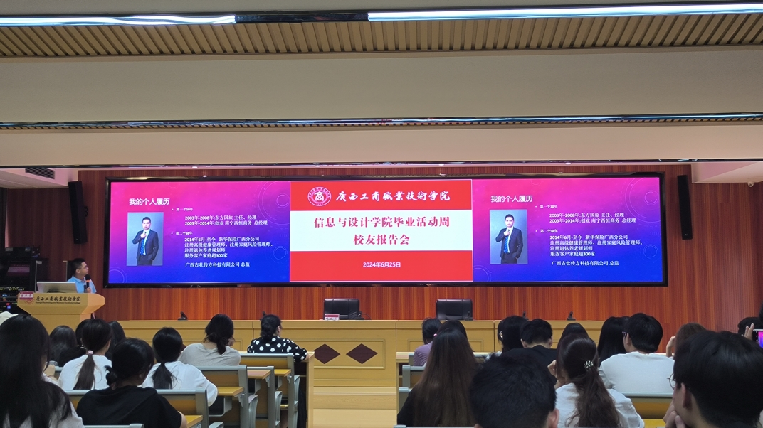 為增強(qiáng)學(xué)院與校友之間的溝通交流,學(xué)習(xí)借鑒優(yōu)秀校友的經(jīng)驗(yàn),引導(dǎo)在校學(xué)生樹立正確的職業(yè)認(rèn)知,激勵廣大學(xué)生成長成才,信息與設(shè)計(jì)學(xué)院于2024年6月25日在鵬飛校區(qū)2145會議室舉辦信息與設(shè)計(jì)學(xué)院畢業(yè)活動周校友報(bào)告會。報(bào)告會由我院教學(xué)副院長唐燕雯主持,會議邀請微機(jī)0035班葉統(tǒng)樂校友回校做報(bào)告,信息與設(shè)計(jì)學(xué)院師生220多人到會聆聽。