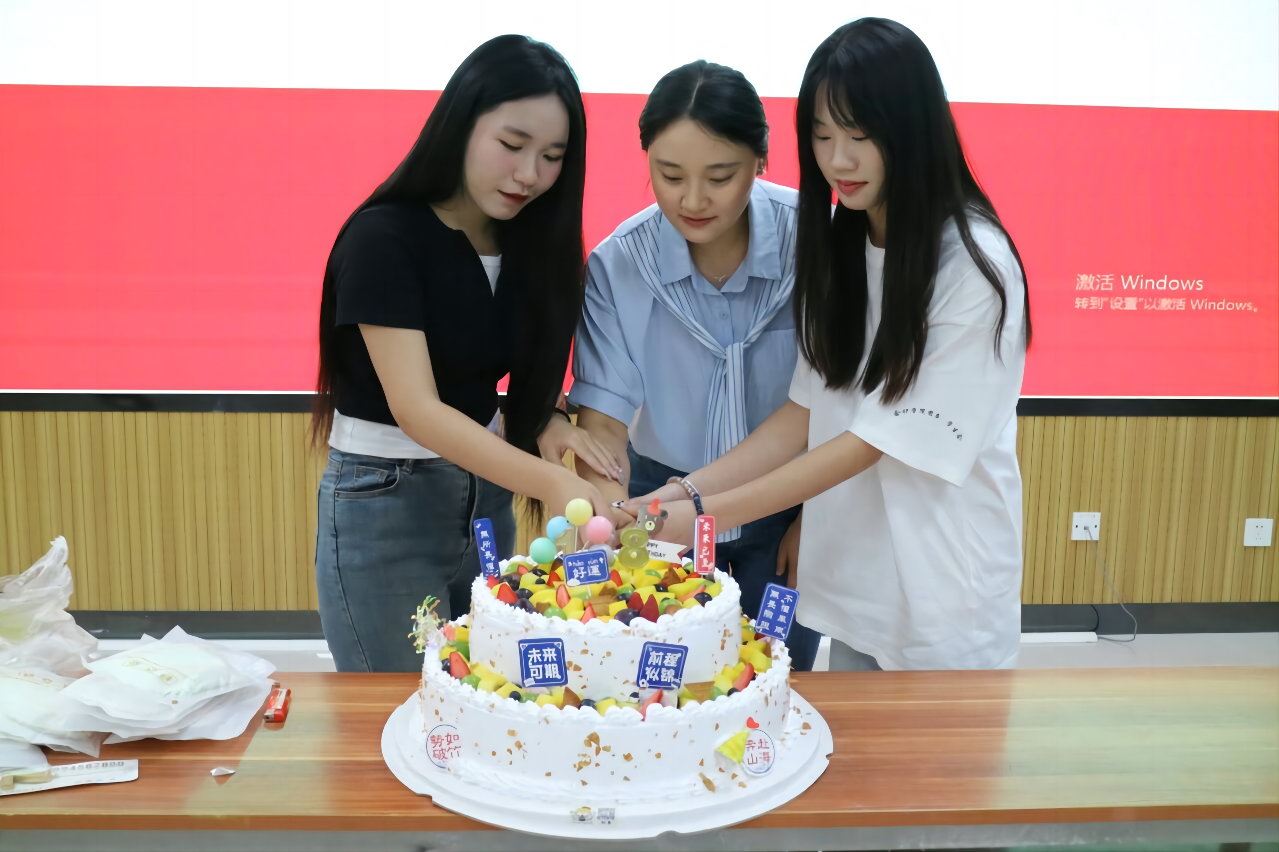 (圖為劉倩老師、22級執(zhí)行主席古蕓瑕和23級實習執(zhí)行主席李雪怡切蛋糕)