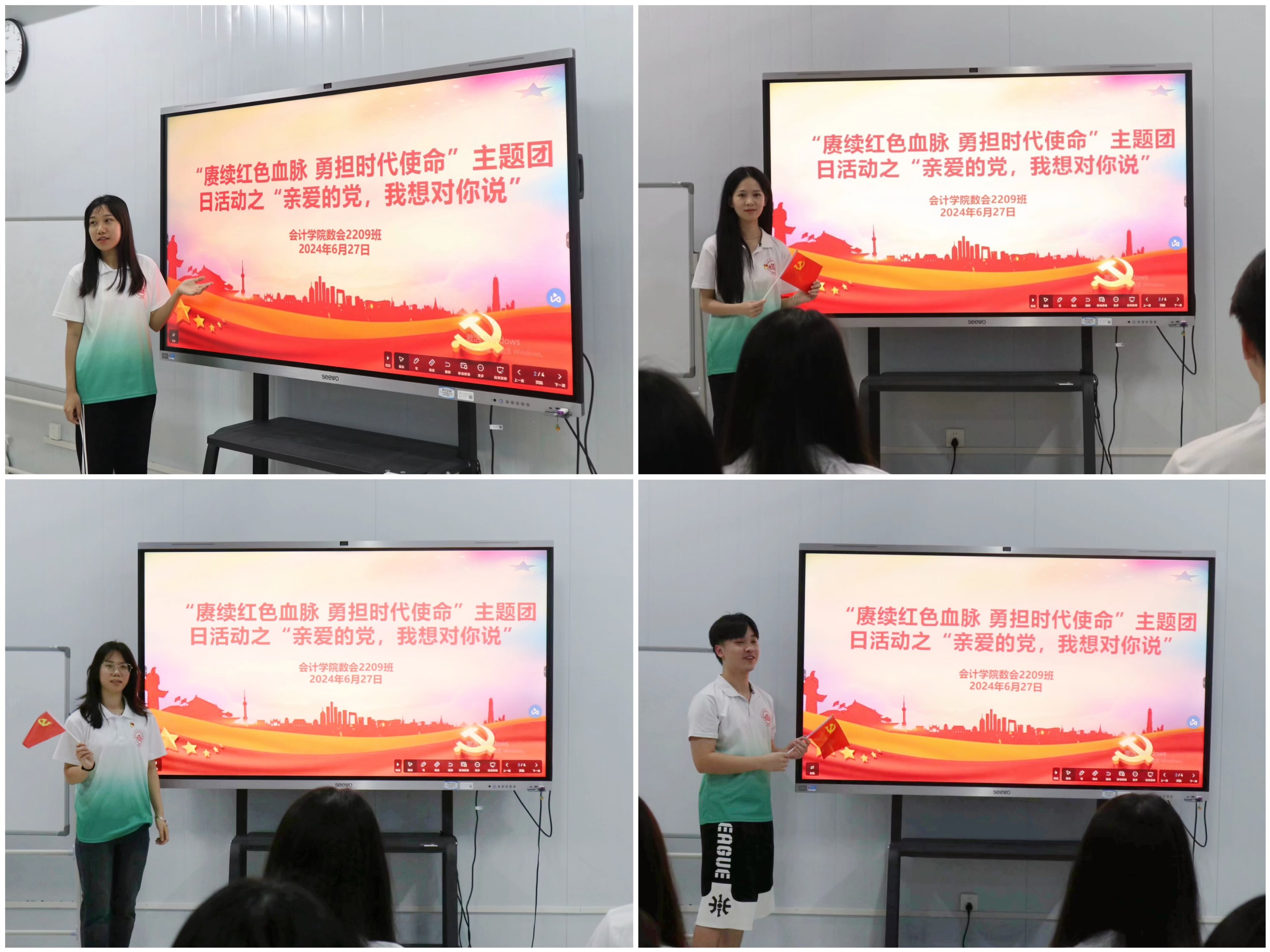2024年6月27日,班級6名預(yù)備黨員、入黨積極分子代表、青年群眾代表分別暢談心聲,向黨表白。其中,今年上半年剛成為預(yù)備黨員的邢莉川同學(xué)表示“感謝黨的培養(yǎng),今年十分榮幸能夠加入中國共產(chǎn)黨,我一定不會辜負(fù)黨對我的期望,繼續(xù)艱苦奮斗,鍛煉過硬本領(lǐng)。愿偉大的中國共產(chǎn)黨永放光芒”。心中有黨,黨的光輝就能照耀同學(xué)們前進(jìn)的方向,通過對黨的表白,激勵同學(xué)們感黨恩、聽黨話、跟黨走。